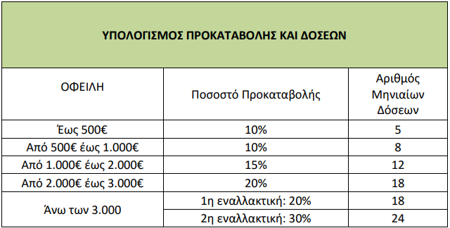 Ο υπολογισμός της προκαταβολής και των δόσεων είναι απλούστατος και γίνεται, ανάλογα με το ύψος της οφειλή, ως εξής: